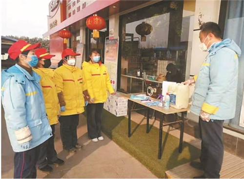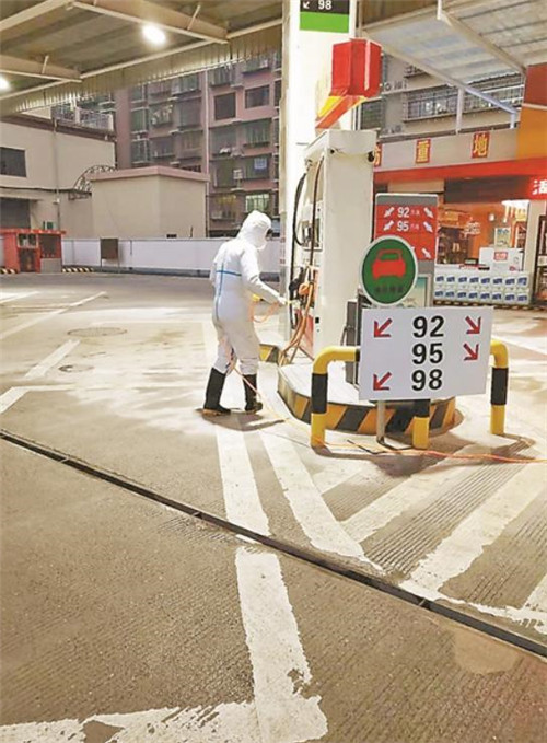 湖南销售:党员利用下班时间坚守现场,做防控疫情的消毒员,各加油站做到每天3次对经营区域、公厕用消毒液进行全面消毒。特约记者 张立军 摄