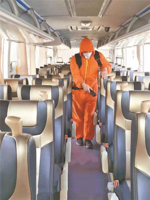 运输公司:广东分公司驾驶员每天进行出车前、收车后的消毒,重点对地面,车门把手、空调出风口进行喷洒和擦拭消毒。特约记者 王康 摄