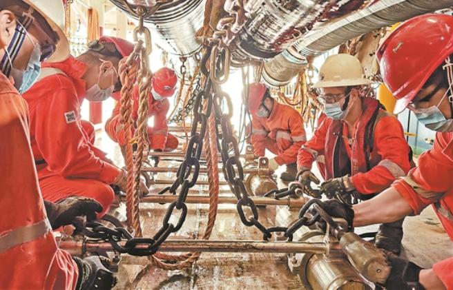 正在阿联酋波斯湾作业的ADNOC项目物探处252队震源船上的队员们抢修设备。郝跃跃 李晨光 摄影