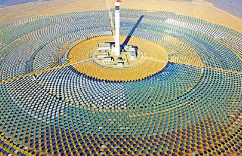 近年来,新疆哈密市依托当地丰富太阳能资源,不断加大太阳能发电项目的建设力度,目前已有20多家企业落户哈密,光伏发电电站装机规模突破170万千瓦。图为哈密市伊吾县淖毛湖镇中电工程哈密熔盐塔式5万千瓦光热发电站一角。蔡增乐摄(人民视觉)
