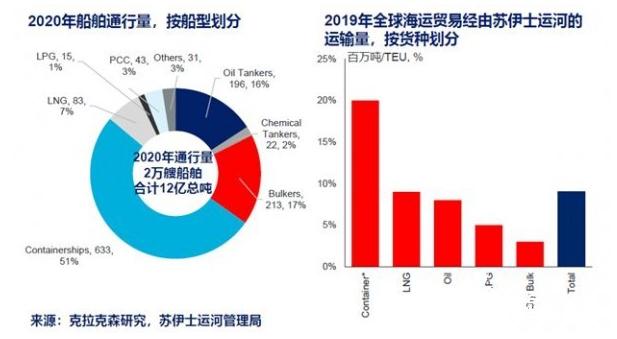 克拉克森研究预计全球海运贸易的9%(2019年约10亿吨)通过苏伊士运河运输,其中超过20%为集装箱贸易,8%为石油贸易,9%为液化天然气贸易。