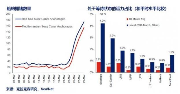 克拉克森研究预计运河恢复通行后,船舶通行量可恢复至每天80-100艘,当前拥堵情况在4-5天将得到解除。3月30日Sea/Net数据显示已有100余条船舶通过运河。
