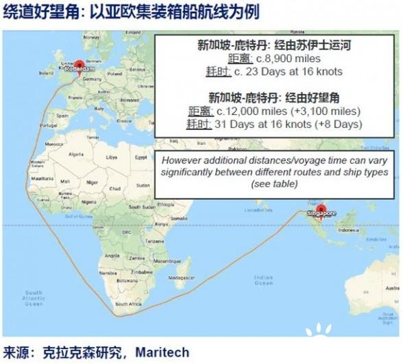 许多船只不得已改航绕道开普敦(见下图);单程额外增加约3,000-7,000海里(取决于具体航程)海运距离。克拉克森研究粗略推算一艘航行于远东-欧洲的集装箱船以每小时16节航速航行,此举多增加航行时间8天;一艘以12节航速于地中海航线上的Suezmax型油轮额外增加超20天航行时间。以新加坡-鹿特丹路线的20,000TEU的大型集装箱船为例,额外增加航次燃料成本48万美金;以2010年建英国-亚洲路线LR2为例,航次燃料成本额外增加20万美金。此外,还需要支付额外的船期费用(尽管可以豁免苏伊士运河的通行费)。