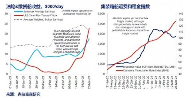 运河堵塞的最初影响包括油轮市场中一些收益的显著上涨,例如Suezmax型油轮和LR2型成品油轮。与此同时,运河拥堵也进一步推涨了集装箱船的期租租金,集装箱船租船费率指数在3月上升14%;虽然集装箱船即期运费目前看来较为稳定,但也有上升潜力。另一方面,尽管此前疫情为全球石油需求复苏带来了持续性压力,原油价格承压。但是在此次运河堵塞事件的影响下原油价格出现剧烈波动,3月24日的价格较3月23日上涨6%。目前苏伊士运河已经恢复通行,后续将持续关注港口拥堵,船期延误等以及其连锁产生的商业问题。