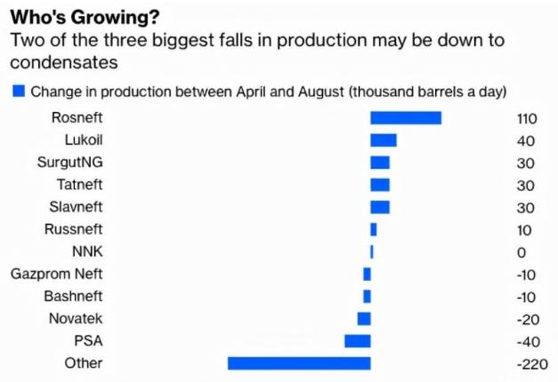 俄罗斯生产的不确定性部分在于定义。OPEC+协议只适用于原油,不包括凝析油——一种从气田中提取的轻质石油。而俄罗斯能源部公布的官方产量数据将两者加在一起。作为全球最大的天然气生产国,凝析油的产量相当可观。其产量相当于每天80万桶左右,占俄罗斯石油总产量的8%,但凝析油的产量可能会随着天然气产量的季节性变化而变化。