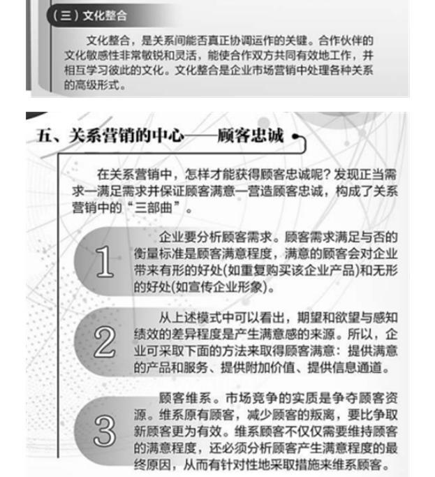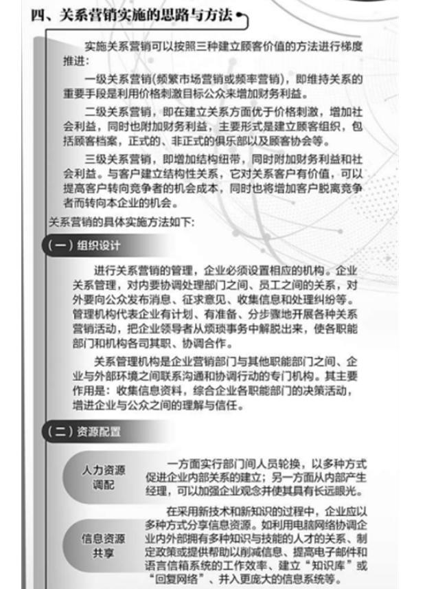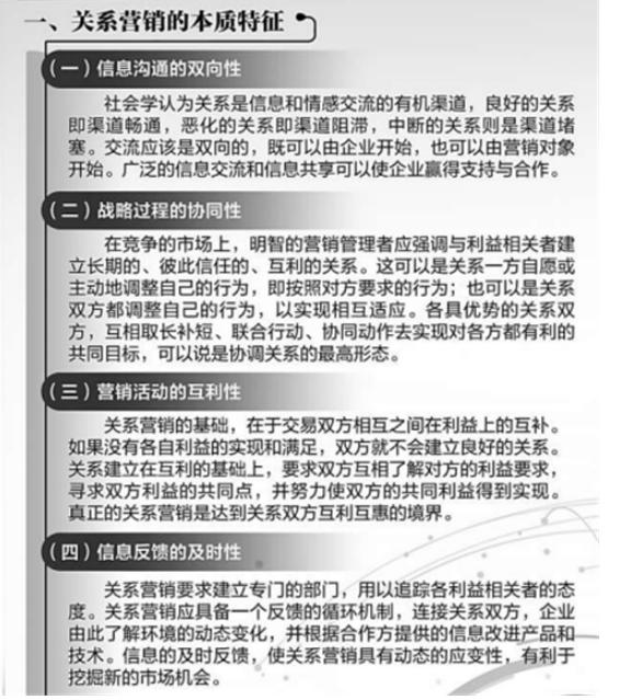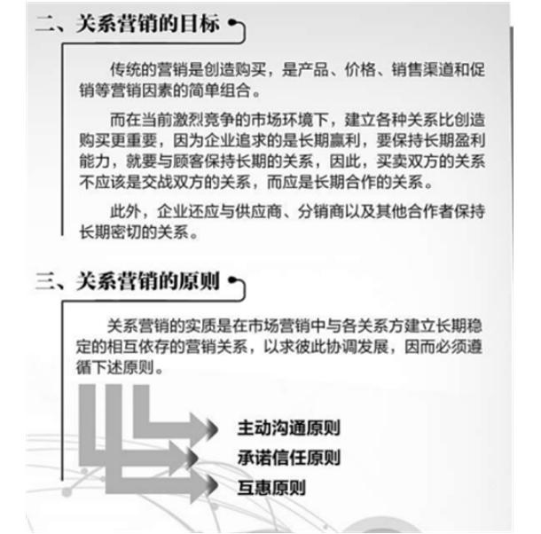 关系营销将建立与发展同所有利益相关者之间的关系作为企业营销的关键变量,把正确处理这些关系作为企业营销的核心。具体来说,关系营销包含三方面的含义:建立关系是指企业向顾客作出各种许诺;保持关系的前提是企业履行诺言;发展关系是指企业履行以前的诺言之后,向顾客作出一系列新的许诺。