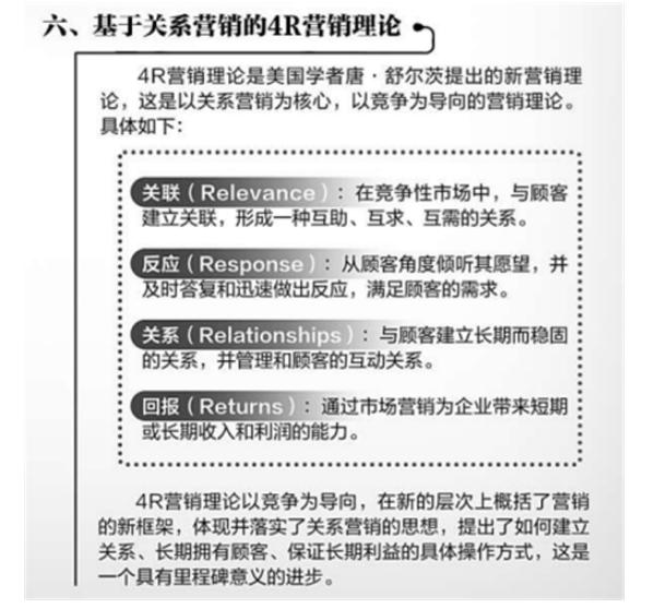 它把营销活动看成是一个企业与消费者、供应商、分销商、竞争者、政府机构及其他公众发生互动作用的过程,其核心是建立和发展与这些公众的良好关系。1985年,巴巴拉·本德·杰克逊提出了关系营销的概念,使人们对市场营销理论的研究,又迈上了一个新的台阶。关系营销理论一经提出,迅速风靡全球,杰克逊也因此成了美国营销界备受瞩目的人物。科特勒评价说:“杰克逊的贡献在于,他使我们了解到关系营销将使公司获得较之其在交易营销中所得到的更多。”