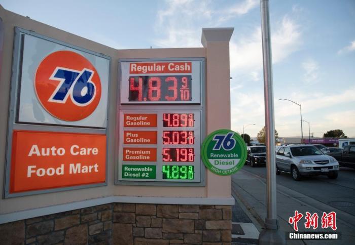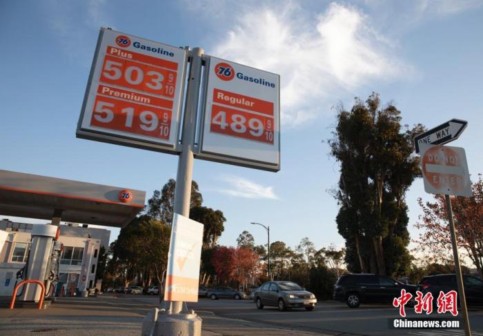 资料图:当地时间11月16日,汽车从美国加州圣马刁县一处加油站旁经过。据美国汽车协会的数据,加利福尼亚州的汽油价格当日创下历史新高,每加仑普通汽油的平均价格飙升至4.687美元,居全美各州之首。这是加州连续第3天打破油价纪录。中新社记者刘关关摄