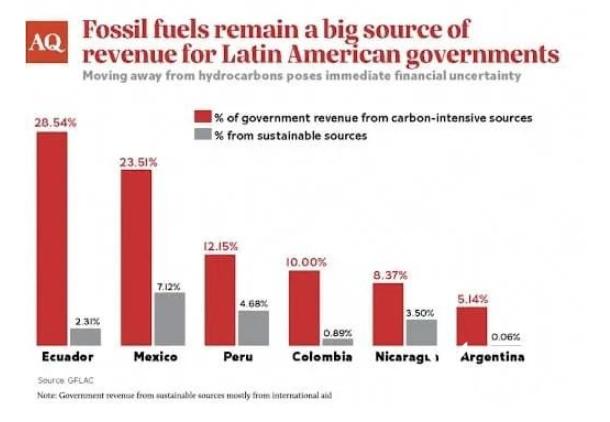 美洲开发银行(IDB)的一份报告显示,在符合1.5度目标(G20达成的协议,即将全球升温控制在1.5度)的情况下,拉丁美洲的石油产量到2035年需要下降到每天少于400万桶——比疫情爆发前的水平低60%。这将意味着在2035年之前,高达81%的探明储量、估计储量和真正储量将不会得到使用。财政影响将是巨大的:如果强有力的全球气候行动得以实现,该地区的石油出口国到2035年将损失约3万亿美元的特许权使用费。