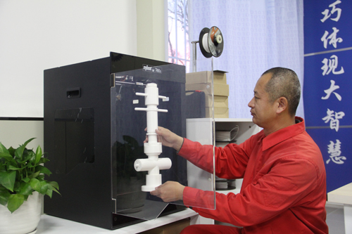 大庆油田刘丽工作室员工展示应用3D技术打印的产品——“节能型上下可调式盘根盒”模型。刘野摄