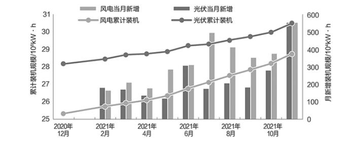 近年来,我国可再生能源发展迅猛,特别是风电和光伏装机规模大幅度增加,可再生能源发电装机容量及年新增发电装机都稳居世界第一。截至2021年底,全国发电装机容量约23.8亿千瓦,其中可再生能源发电装机达到10.63亿千瓦,占总发电装机容量的44.7%,特别是风电和光伏发电占到26.7%。在2021年的新增发电装机中,可再生能源新增装机占76.1%,其中风电和光伏占比超过58%。