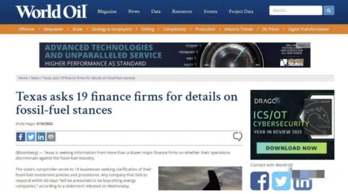 2022年3月16日,《世界石油》网站刊发了彭博社雪莉·哈根的文章,“德克萨斯州向19家金融公司问询对化石燃料行业的态度”,依据第13号法案,德州政府已经启动了问询有关金融机构对油气等化石燃料业务的政策。