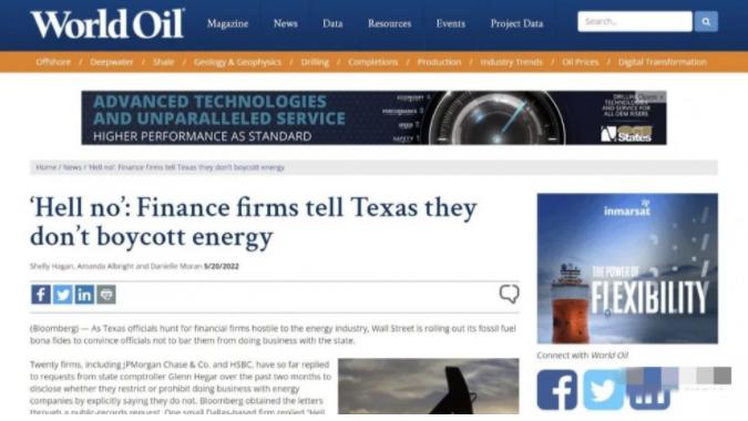 2022年5月20日,《世界石油》网站刊发了彭博社雪莉·哈根、阿曼达·奥尔布赖特和丹妮尔·莫兰的文章,“绝对不会:金融公司告诉德克萨斯州他们不抵制能源企业”,报道了3月中旬德州审计长问询信函发出后,有关金融机构的回复情况。