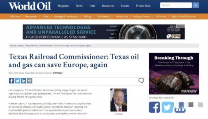 2022年3月21日,《世界石油》网站刊发了德克萨斯铁路委员会主席韦恩·克里斯蒂安的文章,“德州石油天然气将再一次拯救欧洲”,这篇文章修改后又被作为《世界石油》杂志2022年第4期的专栏文章发表。作为德克萨斯铁路委员会主席,克里斯蒂安大力抨击美国拜登政府的能源政策,要求支持石油天然气行业的发展,并自豪地宣称德州的石油天然气可以再一次拯救欧洲。