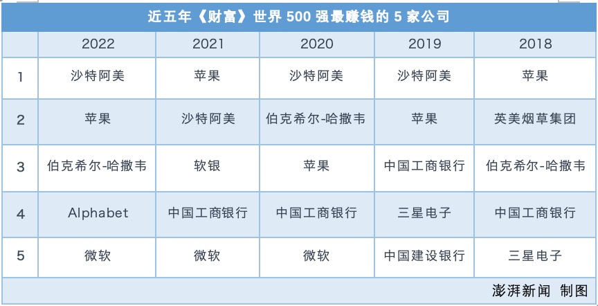 澎湃新闻梳理近五年《财富》世界500强利润榜发现,沙特阿美曾在2019年、2020年连续两年登顶,2021年跌落榜首、位居第二。
