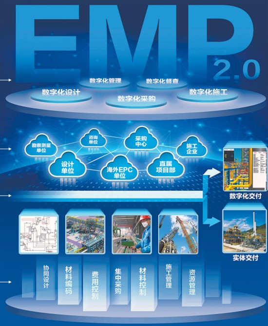 在广东石化炼化一体化项目建设中,CPECC广东石化项目部在EMP2.0基础上优化升级了设计、采购、施工、文档管理及外部协同等业务模块,覆盖了项目生产管理的各个环节,极大节约了人力、物力和时间成本,实现项目业务的在线协同、数据有效积累和共享,提升了项目管理质量和效率。