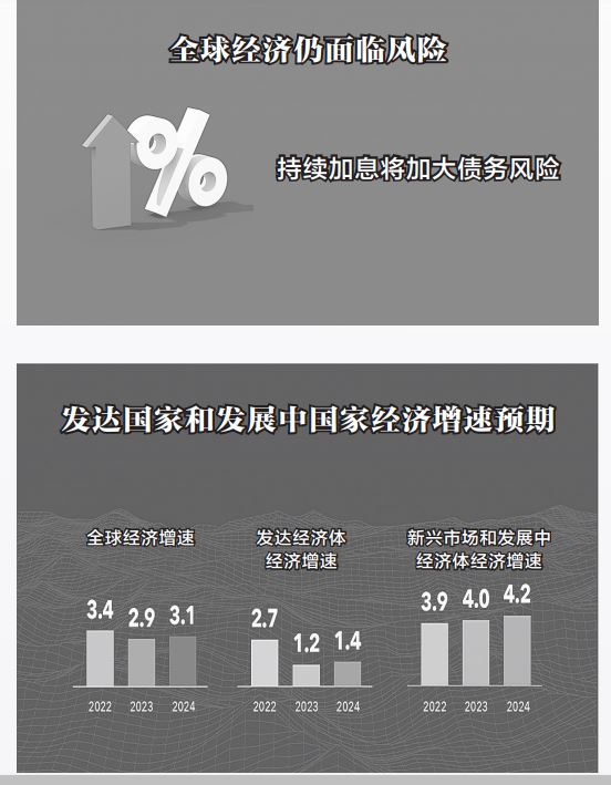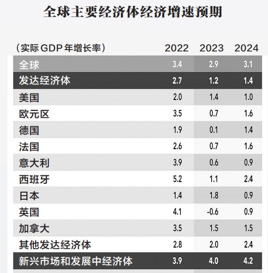 IMF发布《世界经济展望报告》预计,全球经济增长速度将从2022年的3.4%降为2023年的2.9%,并将在2024年反弹至3.1%。由于此前担心的油价飙升情形并未出现,且劳动力市场仍保持强劲态势,因此该组织将2023年全球经济增速预期由2.7%上调为2.9%。不过,格奥尔基耶娃认为今年全球经济仍将面临“困难的一年”,顽固的高通货膨胀将持续。