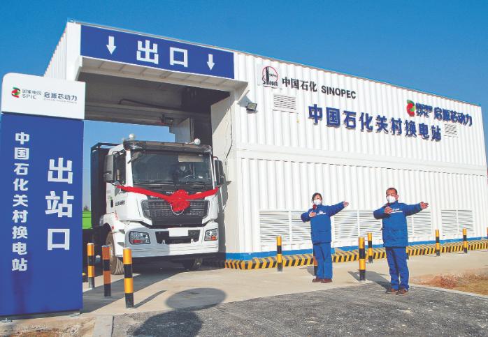 图为山西石油与国家电投合作建设的山西首座重卡换电站,这是中国石化在全国投入运营的第二座重卡换电站。