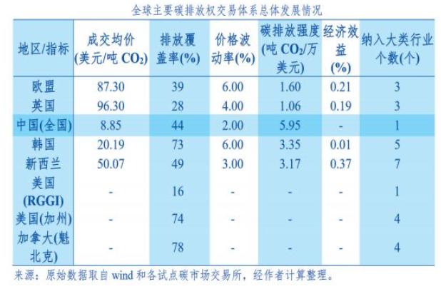 相较于其他全球主要碳排放权交易体系,中国碳排放强度处于较高水平(5.95吨二氧化碳/万美元),全国碳市场成交均价和价格波动率处于较低水平(分别为8.85美元/吨二氧化碳和2%)。