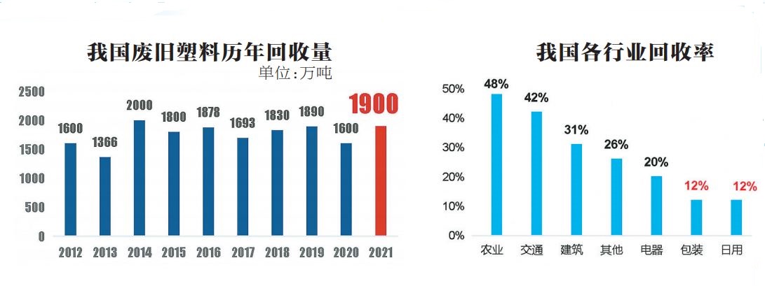 中国是全球最大的塑料制造、消费和出口国,近年来,随着人民生活水平不断提升,废塑料产量也逐年上升。2021年,中国固废构成中塑料占比12%。同时,由于人们环保意识逐步增强,塑料回收比例也稳步提升。经合组织2020年的报告显示,预计到2060年废塑料全生命周期回收率将从2019年的8%提升到14%。