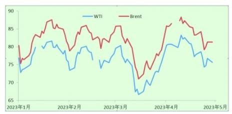今年前4个月,国际油价整体呈现出近年来少有的“四起四落”短期高位波动走势。其中,受多个国家通货膨胀数据回落、美联储阶段性加息预期结束,以及美国能源信息署(EIA)等机构发布对今年原油需求乐观预期等因素影响,布伦特原油价格今年第二周累计涨幅约8%,并在1月稳定保持在80美元/桶以上;2月1日前后,受德国等部分经济体经济增长数据低于预期,以及美欧央行计划加息等因素影响,布伦特原油和WTI价格一周内跌幅分别超过7%,之后又因俄罗斯预期减产、土耳其地震和全球经济复苏乏力等影响,再度出现较大幅度连续震荡走势;3月中旬,美国硅谷银行和签字银行等金融机构“爆雷”导致金融市场恐慌,布伦特原油和WTI价格双双跌破70美元/桶后,随着有关银行“转危为安”而呈现“V型”反转;4月初以来,欧佩克+集体自愿减产叠加市场对全球经济不确定预期等复杂因素影响,国际油价在跳涨至今年前4个月高点后,又出现了一波小幅下跌整理,布伦特原油价格目前仍维持在70美元/桶左右。5月3日,布伦特原油期货结算价为72.33美元/桶,WTI原油期货结算价为68.6美元/桶。