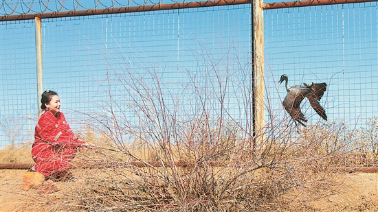 卡拉麦里山自然保护区 新疆油田准东采油厂火烧山作业区运行班员工在给收留的蓑羽鹤喂食。余建华 摄