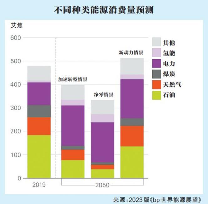 《bp世界能源展望》围绕3种能源转型情景展开,包括净零情景、加速转型情景和新动力情景。净零情景和加速转型情景假定全球气候政策大幅收紧。在净零情景下,到2050年,全球碳排放量将比2019年的水平减少约95%。在加速转型情景下,到2050年,全球碳排放量将减少约75%。社会观念和消费者行为的转变,将进一步提高能源利用效率,并增加低碳能源的使用。新动力情景旨在反映当前全球能源系统的整体运行轨迹,并将近年来各国政府的脱碳政策和承诺纳入考量。