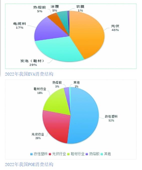 2022年我国POE进口量68万吨,主要用于塑料改性、光伏胶膜、发泡鞋材、热熔胶等领域,随着双玻组件、双面电池大规模应用,POE光伏胶膜消费将保持旺盛增长态势,POE与EVA多层共挤胶膜(EPE)在光伏中的使用会进一步提高。
