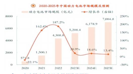 预计2023~2025年我国新能源汽车销量分别突破900万、1100万、1300万辆,2025年我国动力电池出货量有望接近1太瓦时(1000吉瓦时),市场销售规模将突破7000亿元。