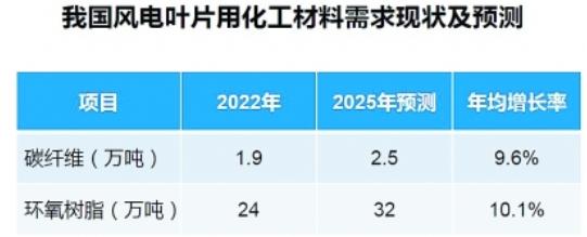 环氧树脂是制造风机叶片的主要基体树脂材料,约占全球风机叶片基体材料的70%以上。乙烯基酯树脂、不饱和聚酯树脂等热固性树脂也经常应用在风机叶片中。2022年,我国风机叶片领域消耗环氧树脂约24万吨,2025年预计将达32万吨以上,年均增速为10.1%。