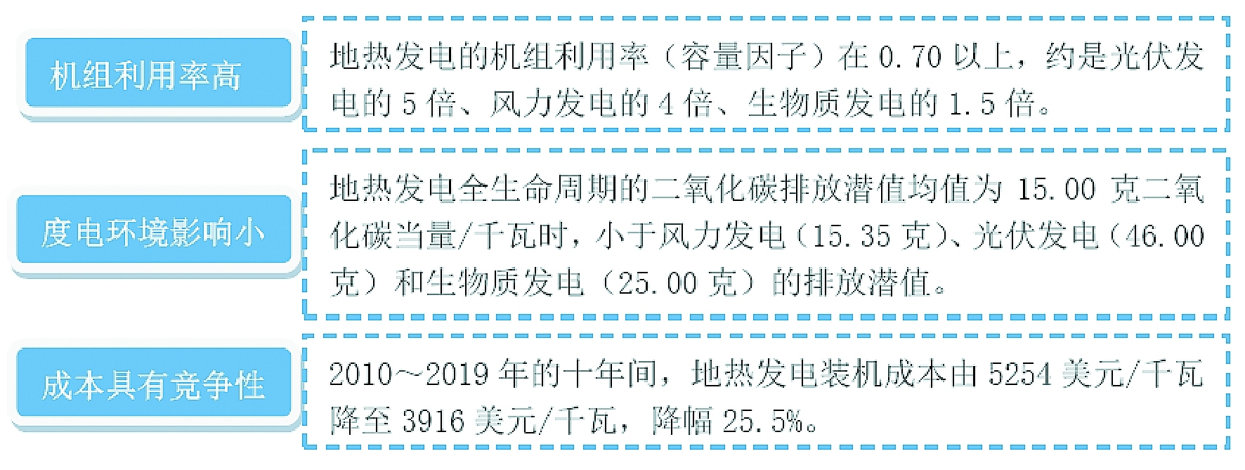 地热发电也是地热能利用的重要方式,具有热能利用率高、环境影响小、发电成本低等优势。与其他可再生能源发电技术相比,地热发电机组还有运行时率高的特点,据世界能源理事会统计,地热发电的利用系数在0.72~0.97,远高于其他形式的利用系数,而且不受天气条件影响,安全稳定、可靠性强。