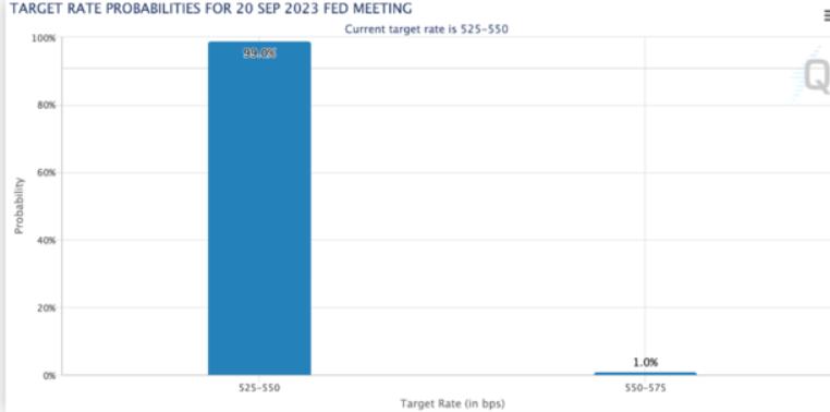 据芝商所FEDWATCHTOOL,市场预计美联储9月跳过加息的概率为99%。