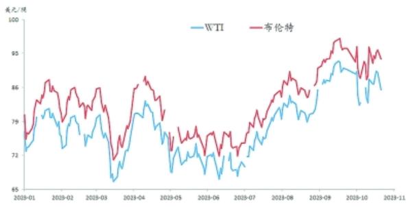 三季度以来,国际油价先是呈现一波显著上涨,随后在80美元/桶以上区间大幅波动。其中,布伦特和WTI两大国际基准油价分别自6月底的70美元/桶左右大幅上涨至9月底的90美元/桶以上,特别是9月28日,布伦特原油和WTI价格盘中分别突破97美元/桶和95美元/桶,均为2022年9月以来最高值。10月后,国际油价波动显著加剧,先是10月初出现一波接近10%的下跌,10月中旬又走出超过10%的上涨行情,10月20日起连续4日明显下跌。截至11月1日,布伦特原油和WTI价格分别为84.63美元/桶和80.44美元/桶。
