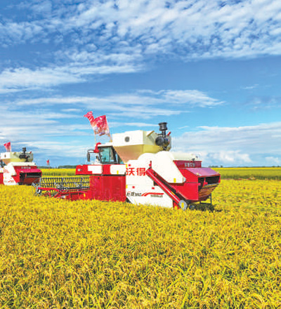 黑龙江北大荒集团江川农场,农机在稻田里作业。