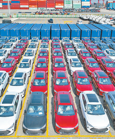 江苏苏州港太仓港区国际集装箱码头上,新能源汽车整齐排列。