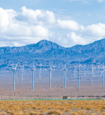 甘肃酒泉玉门市,广袤戈壁上的风机。