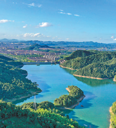 浙江安吉县凤凰水库,碧水蓝天,绿意盎然。