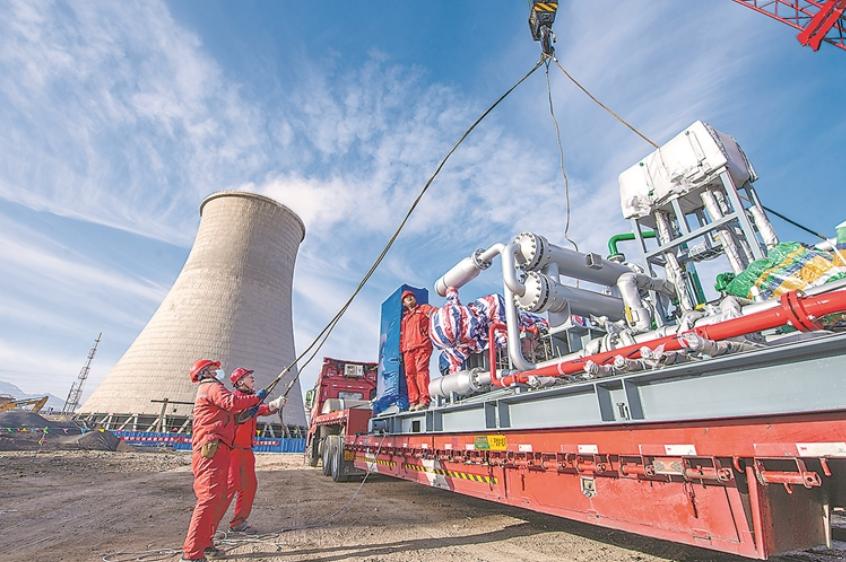 玉门油田员工在可再生能源制氢示范项目现场吊装氢气压缩机。朱俊霖摄