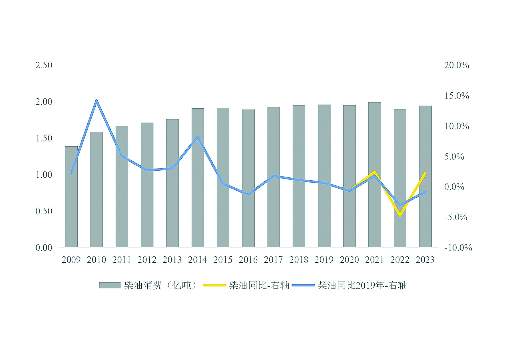 柴油消费涉及行业较多,包括中大型商用车、农用车、农业机械、铁路运输、内河船舶、电力调峰、建筑机械等,与我国宏观经济发展形势和产业结构紧密相关,2015年前后国内柴油消费逐步进入增长停滞阶段。2023年,国内成品油行业在经历了极不平凡的三年后完成过坎爬坡,柴油消费随着用油行业生产节奏恢复正常得到修复,但受宏观经济恢复进程及替代因素影响,仍低于2019年水平;预计2024年柴油消费小幅下降,替代资源加速发展,供大于求态势继续推升出口。