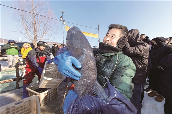鱼塘承包户沈义告诉记者,今年买鱼的人比往年多,冬捕第一天打上来的1万公斤鱼当天全卖了!他承包的鱼塘都是由辽阳石化出资建设的,每年效益十分可观,他和家人也因此过上了好日子!