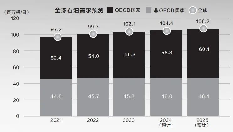 同样是在2023年10月,欧佩克发布了与国际能源署观点截然不同的《2023年世界石油展望报告》,欧佩克预测,到2045年,全球石油消费量将保持增长。2022—2025年、2025—2030年、2030—2035年、2035—2040年、2040—2045年,各时期将分别增长600万桶/日、530万桶/日、230万桶/日、100万桶/日、80万桶/日,各时期的年均复合增长率分别为2.16%、1.07%、0.45%、0.19%、0.15%。