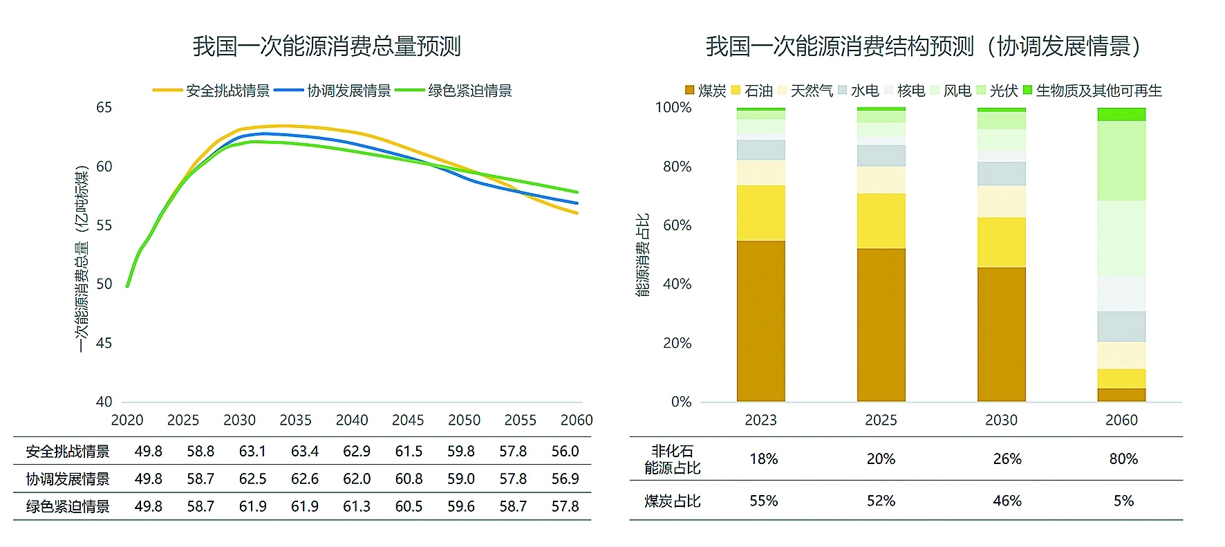 答:随着扩大内需、新型工业化等战略的实施,我国能源消费需求刚性增长,特别是“十四五”以来,我国煤炭等化石能源消费及太阳能、风能等非化石能源消费双双超出预期。因此,《中国能源展望2060(2024年版)》上调了我国能源消费峰值规模,即我国一次能源消费预计将于2030~2035年间达峰,但峰值消费量从前版的60.3亿吨标准煤上调至62.6亿吨标准煤。