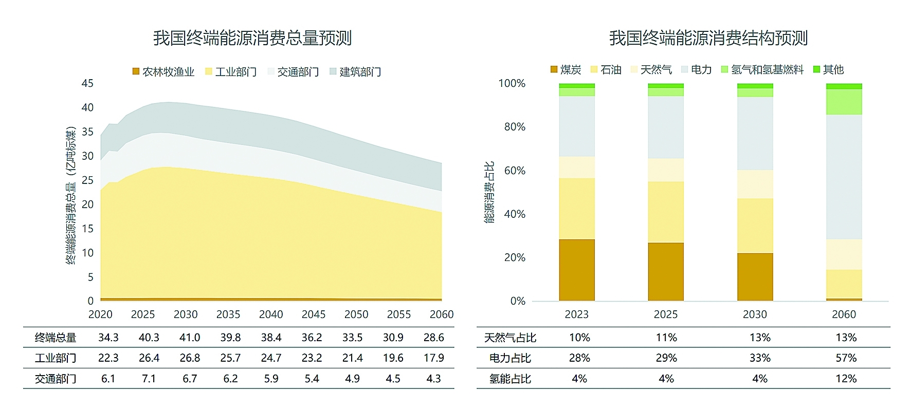 我国终端能源消费规模稳步增长、结构加速优化,2023年总量增至38.5亿吨标准煤,预计“十五五”后期达峰41.2亿吨标准煤,到2060年降至28.6亿吨标准煤。电、氢融合发展加快终端用能绿色低碳转型进程,电力将于“十四五”后期成为终端第一大能源品种,我国终端电氢化率将从当前的32%增至2030年的37%和2060年的69%。