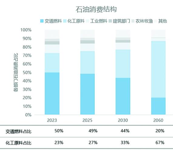 快速下降期(2041~2060年)我国进入中等发达国家水平,消费品需求逐步饱和,加之绿氢、循环再生、二氧化碳资源化等技术突破,对石油替代明显加快,石油需求快速下降,年均降速4%~5%。2060年,石油主要用于化工原料,同时仍有部分航空和水运用油需求、少量道路沥青和润滑油用油需求。