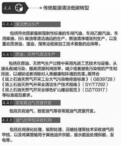 按《目录》要求,现有石油天然气开采和炼油化工业务可以从以下三方面着手,第一,提供清洁低碳能源,发展清洁燃油生产、原油天然气清洁生产、非常规油气资源开发、煤层气(煤矿瓦斯)开采利用、油气田甲烷采收利用。第二,推动绿色低碳发展,持续开展节能降碳改造和能效提升、工艺改进和流程优化、数字化智能化升级。第三,坚持环保优先,深入推进大气、水、固体废物、土壤地下水治理,以及生态保护修复和利用、资源循环利用。