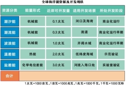 海洋能分为潮汐能、潮流能、波浪能、温差能、盐差能,近岸(海岸线20公里以内)可开发总量是6.4太瓦,但已开发的仅0.53吉瓦,还不足万分之一,潜力巨大。目前全球海洋能装机容量70%位于欧洲。欧盟预计,到2030年海洋能装机容量在可再生能源中所占份额为0.5%~2%。