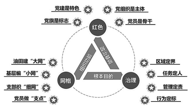 从组织功能上看,工作“千条线”纳入管理“一张网”,即油田建“大网”、基层编“小网”、支部织“细网”、党员做“支点”,形成一张矿权区域全覆盖、各级组织全纳入、广大党员全参与、油田内外全贯通的红色网络,有力推进基层党建“三基本”建设与“三基”工作有机融合。
