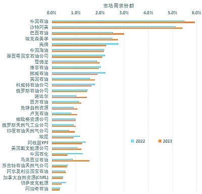 市场需求集中度进一步提升。2023年油气工程市场需求端CR4(前4家企业所占市场份额)为17.1%,比2022年上升1.4个百分点。市场集中度不高,需求端竞争充分,不存在需求垄断情况。中国石油、沙特阿美、巴西石油和埃克森美孚等是市场的主要需求方,4家油公司2023年都大幅增加油气勘探开发投资,在油气工程市场的需求份额有不同程度的提升。排名第五的壳牌石油公司在油气工程市场的需求份额有较大幅度下降。