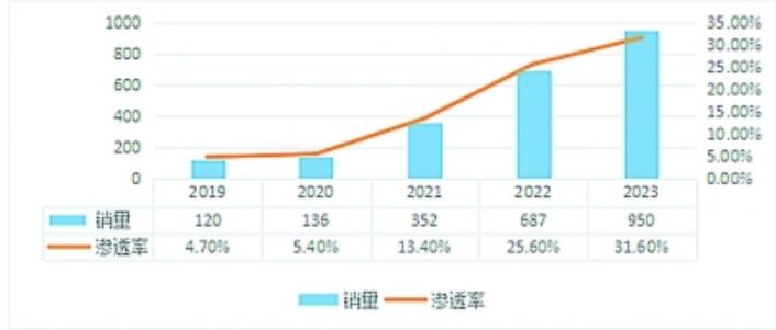 2023年,我国新能源汽车依然保持爆发式增长,全年产销量分别实现959万辆和950万辆。新能源汽车的渗透率也从2019年的4.6%增至2023年的31.6%。