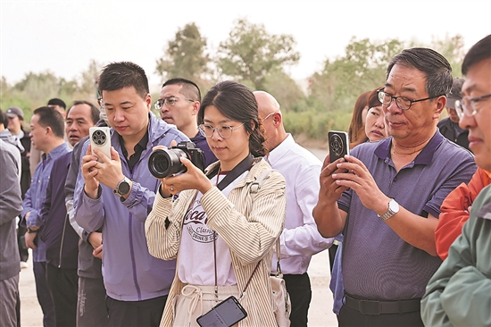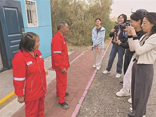 行驶在零碳沙漠公路上,每隔4公里就能看到一座保障灌溉用水的水井房。在48号水井房,记者们见到了守井的周银丰、邱丽兰夫妇。一幢小平房被隔成了生活房、泵房、机房,这就是夫妻俩所有的室内空间。在这片人迹罕至的沙漠中,他俩守护着生命的绿色。大家纷纷用镜头记录下这份平凡却伟大的坚守。来自中国海洋石油报的刘益政感慨道:“在这里,我们感受到的不仅是油气的流动,也是人类不屈的奋斗精神。”